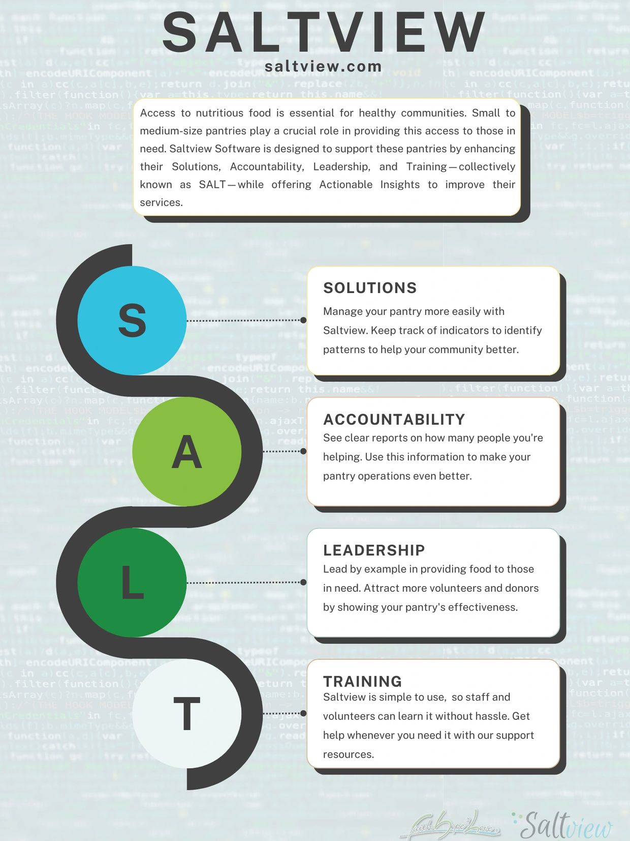 Founded in early 2023, Saltview is food access software designed and created by Faith Hope and Love to help solve the technical challenges and training challenges faced by food pantries today. The Saltview leadership team specializes specifically in food access and pantry training.